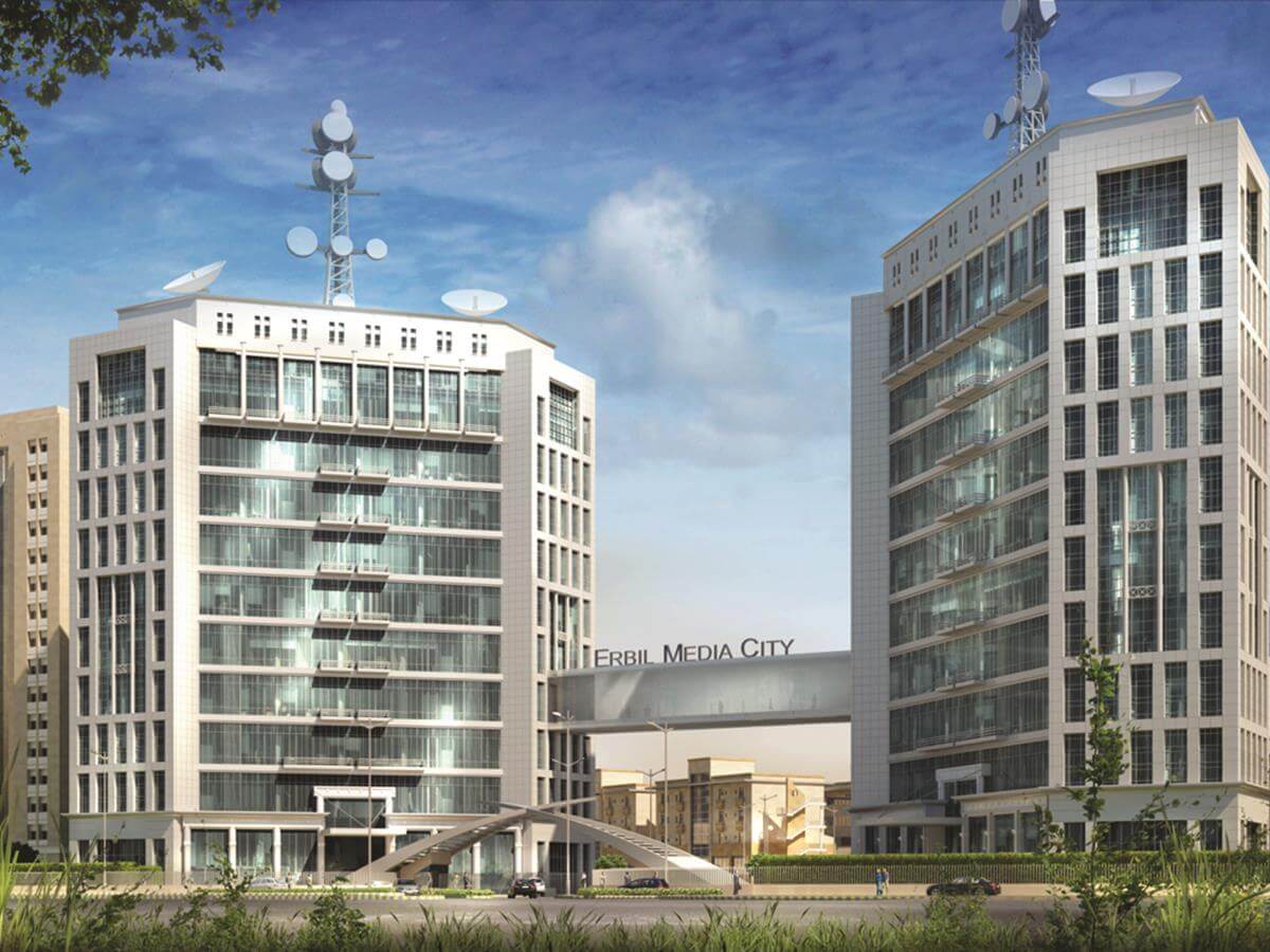 Modern media and entertainment complex in Erbil featuring innovative steel construction and broadcast facilities.