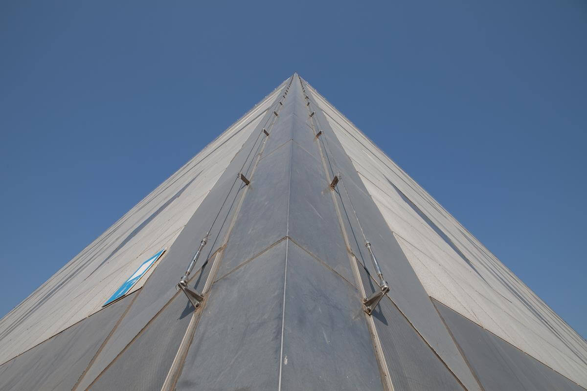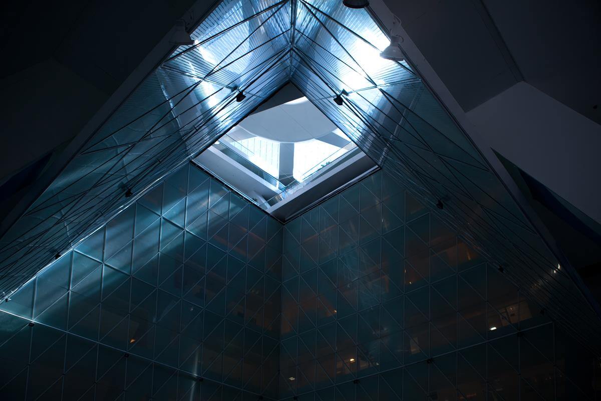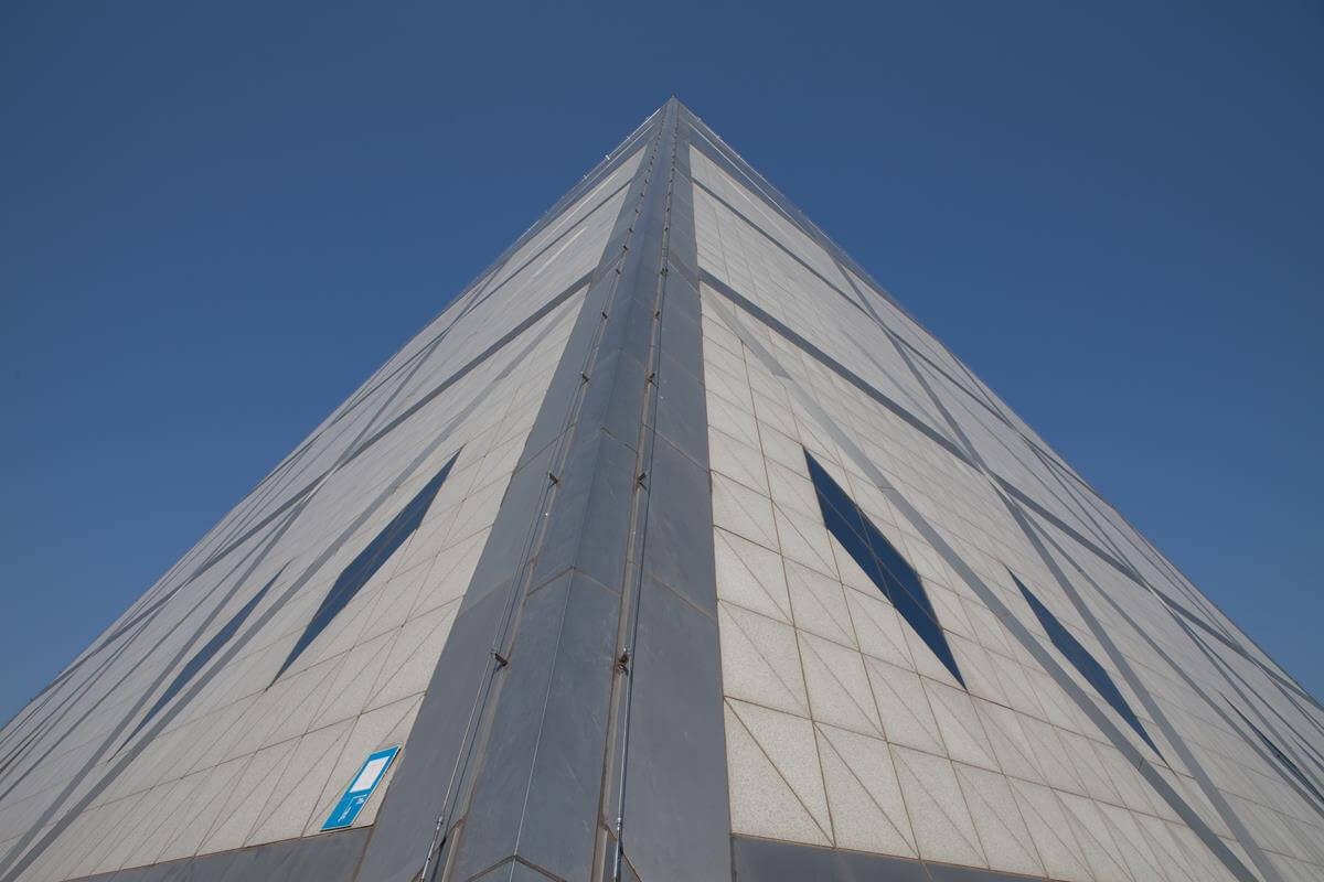 Iconic pyramid-shaped structure designed by Norman Foster, featuring advanced steel and glass construction.